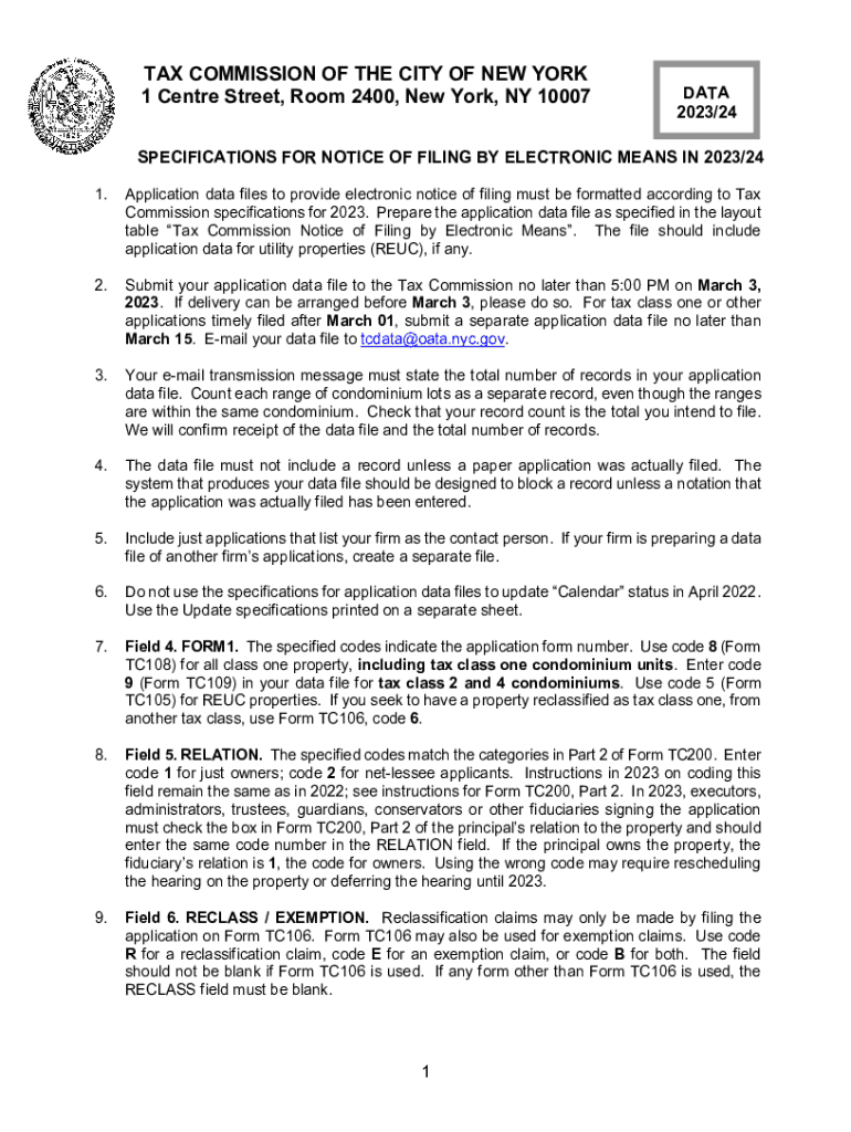 TAX COMMISSION OF THE CITY OF NEW YORK 1 Center Street, Room 2400, New York, NY 10007DATA 2023/24SPECIFICATIONS FOR NOTICE OF FILING BY ELECTRONIC MEANS IN 2023/24 1. Application data files to provide