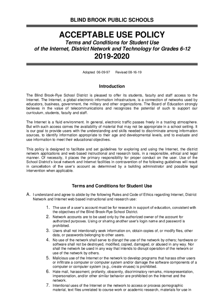 BLIND BROOK PUBLIC SCHOOLSACCEPTABLE USE POLICY Terms and Conditions for Student Use of the Internet, District Network and Technology for Grades 61220192020 Adopted 060997Revised 081619Introduction