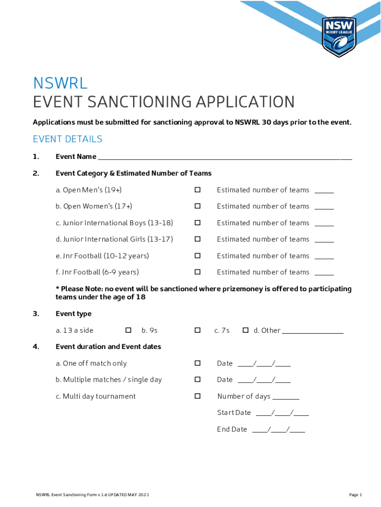 NSW Applications must be submitted for sanctioning approval to NSW 30 days prior to the event. EVENT DETAILS 1. Event Name ___2. Event Category & Estimated Number of Teams a. Open Men (19+)Estimated