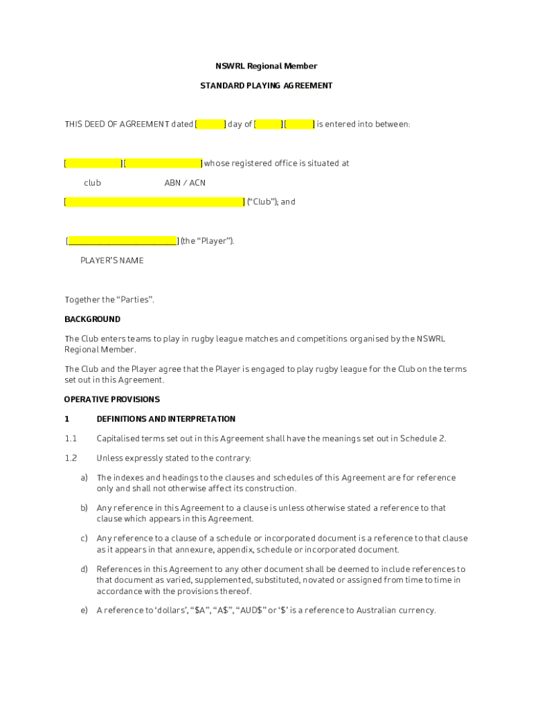 Get the free NSWRL Regional Member STANDARD PLAYING AGREEMENT