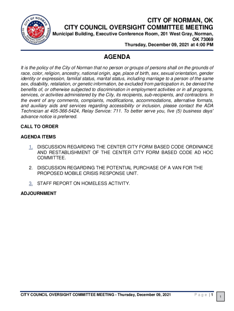 CITY OF NORMAN, OK CITY COUNCIL OVERSIGHT COMMITTEE MEETING Municipal Building, Executive Conference Room, 201 West Gray, Norman, OK 73069 Thursday, December 09, 2021, at 4:00 AGENDA It is the policy
