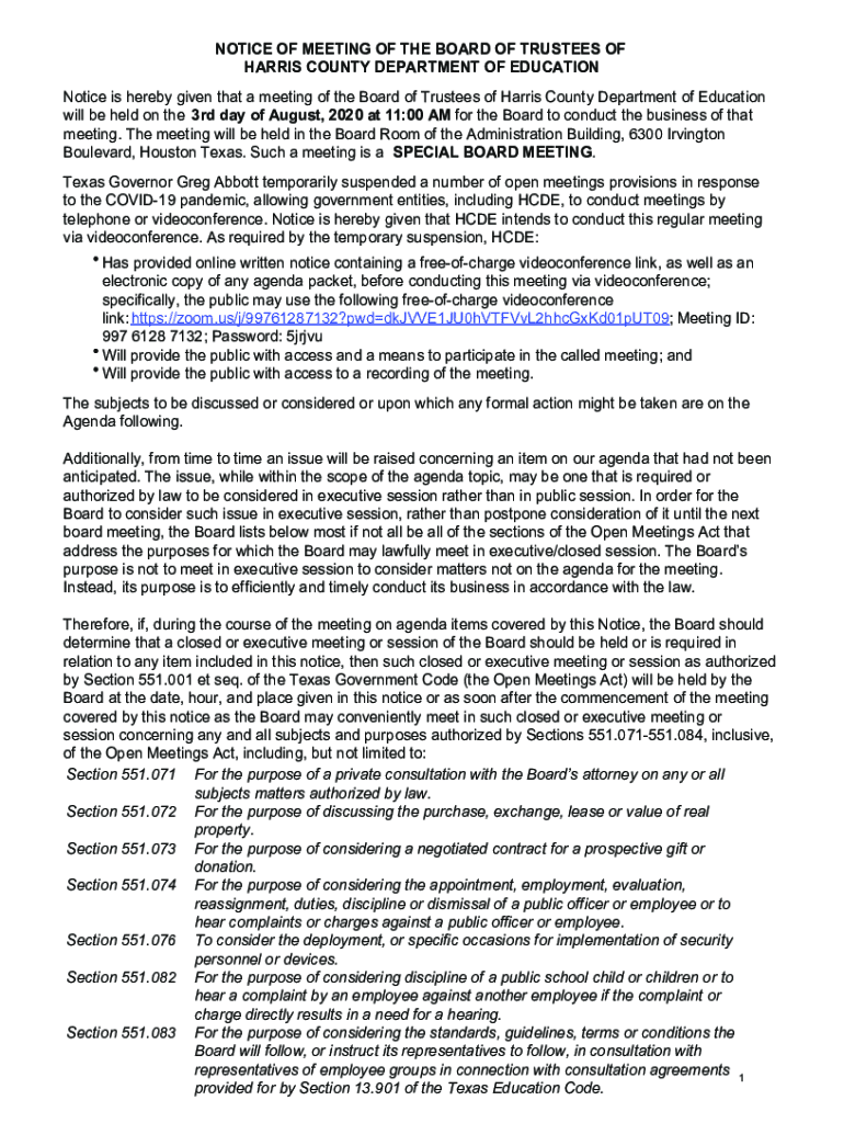 NOTICE OF MEETING OF THE BOARD OF TRUSTEES OF HARRIS COUNTY DEPARTMENT OF EDUCATION Notice is hereby given that a meeting of the Board of Trustees of Harris County Department of Education will be