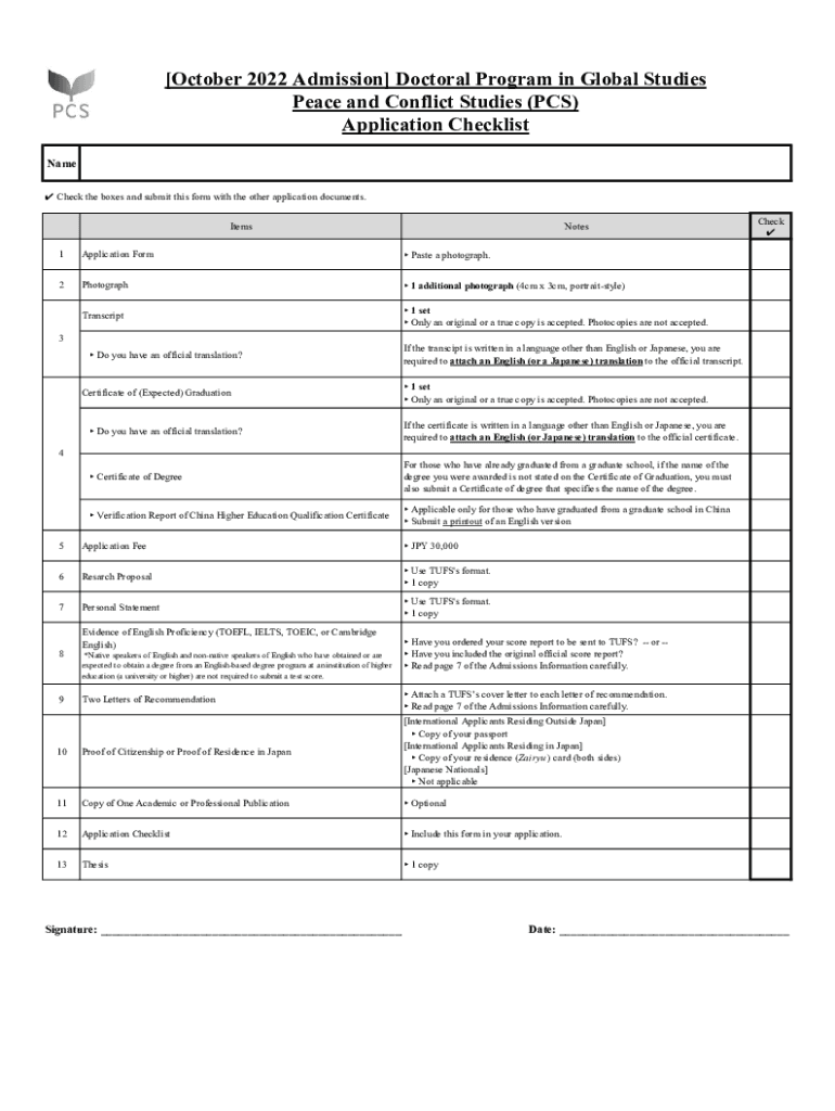 [October 2022 Admission] Doctoral Program in Global Studies Peace and Conflict Studies (PCS) Application Checklist Name Check the boxes and submit this form with the other application documents. ItemsNotes1Application