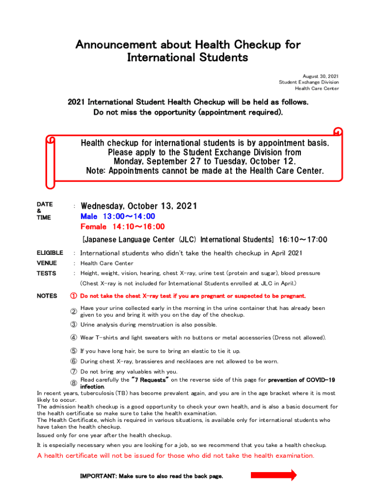 Announcement about Health Checkup for International Students August 30, 2021, Student Exchange Division Health Care Center2021 International