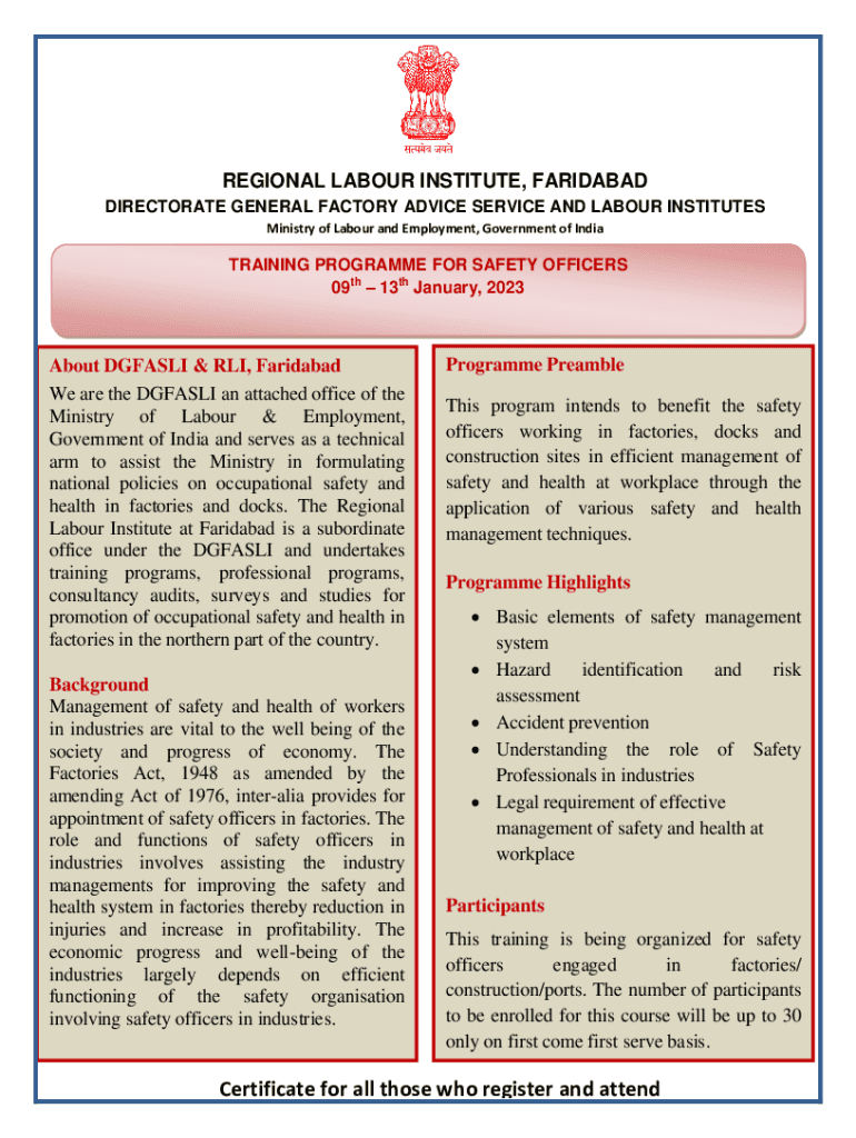 Ministry of Labor and Employment, Government of Distraining Program FOR SAFETY OFFICERS
