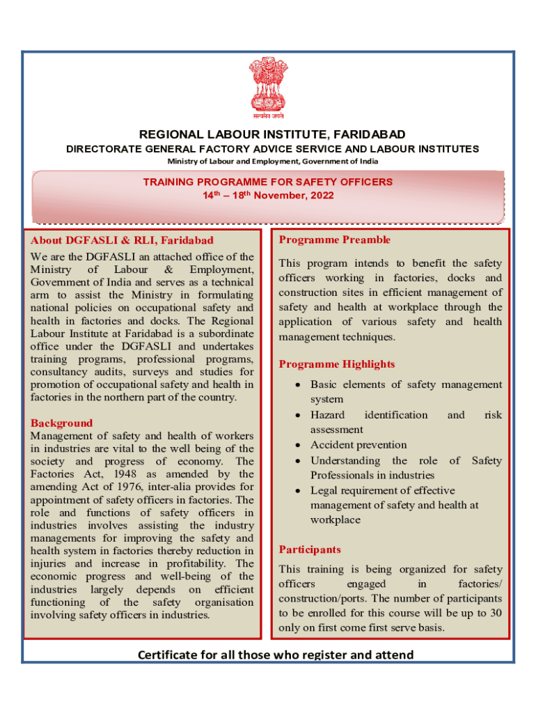 Ministry of Labor and Employment, Government of Distraining Program FOR SAFETY OFFICERS