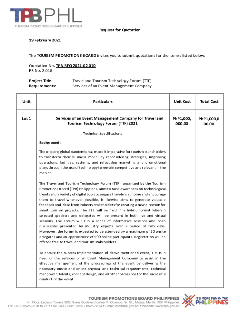 Request for Quotation 19 February 2021The TOURISM PROMOTIONS BOARD invites you to submit quotations for the item/s listed below: Quotation No. TURF 202102070 PR No. 2.018 Project Title: Requirements:Unit