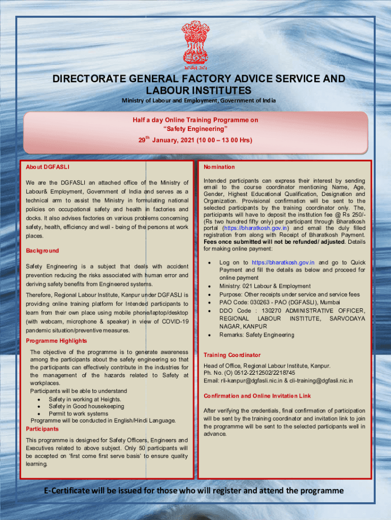DIRECTORATE GENERAL FACTORY ADVICE SERVICE AND Labor INSTITUTES Ministry of Labor and Employment, Government of India Half a day Online Training Program on Safety Engineering th29January, 2021 (10