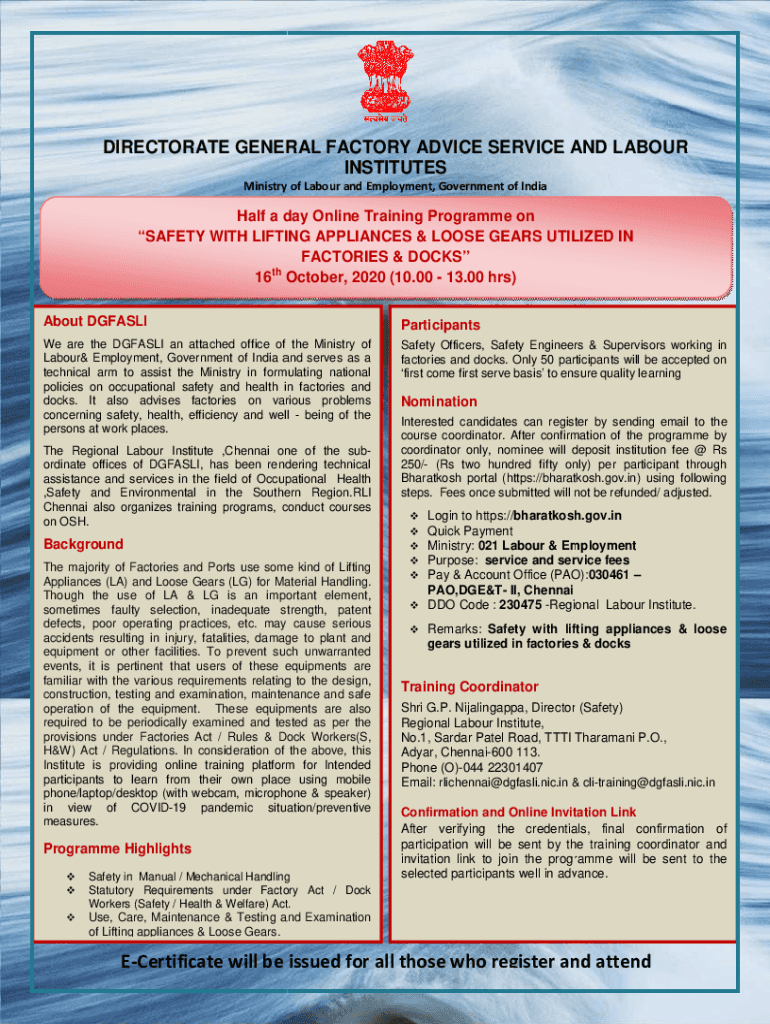 DIRECTORATE GENERAL FACTORY ADVICE SERVICE AND Labor INSTITUTES Ministry of Labor and Employment, Government of Indiana a day Online Training Program on SAFETY WITH LIFTING APPLIANCES & LOOSE GEARS
