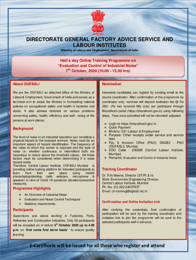DIRECTORATE GENERAL FACTORY ADVICE SERVICE AND Labor INSTITUTES Ministry of Labor and Employment, Government of Indiana a day Online Training Program on Evaluation and Control of Industrial Noise