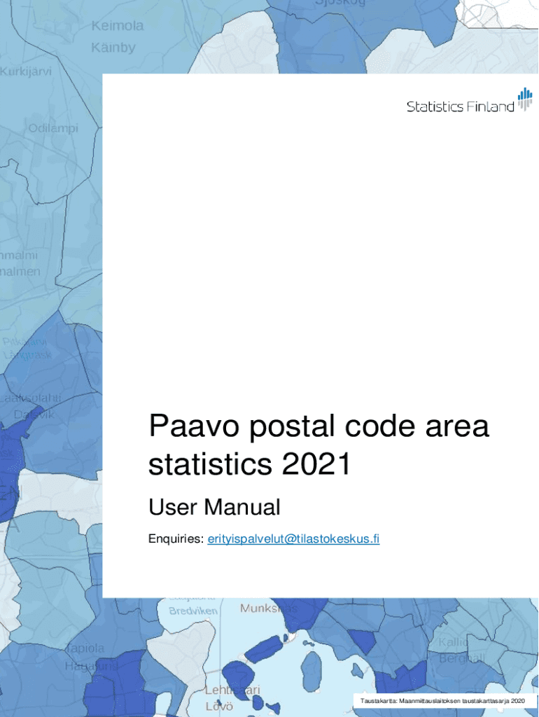 Piano postal code area statistics 2021 User Manual Inquiries: erityispalvelut@tilastokeskus.fiTaustakartta: Maanmittauslaitoksen taustakarttasarja 2020Paavo postal code area statistics 2021 User malcontent
