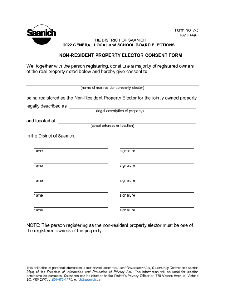 Form No. 73 LGA s.66(6)THE DISTRICT OF SAANICH 2022 GENERAL LOCAL and SCHOOL BOARD ELECTIONSNONRESIDENT PROPERTY ELECTOR CONSENT FORM We, together with the person registering, constitute a majority