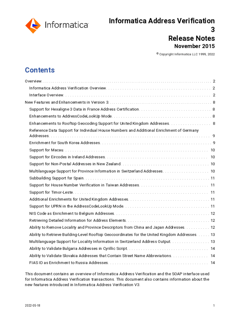Informatica Address Verification 3 Release Notes November 2015 Copyright Informatica LLC 1999, 2022Contents Overview. . . . . . . . . . . . . . . . . . . . . . . . . . . . . . . . . . . . . . . .