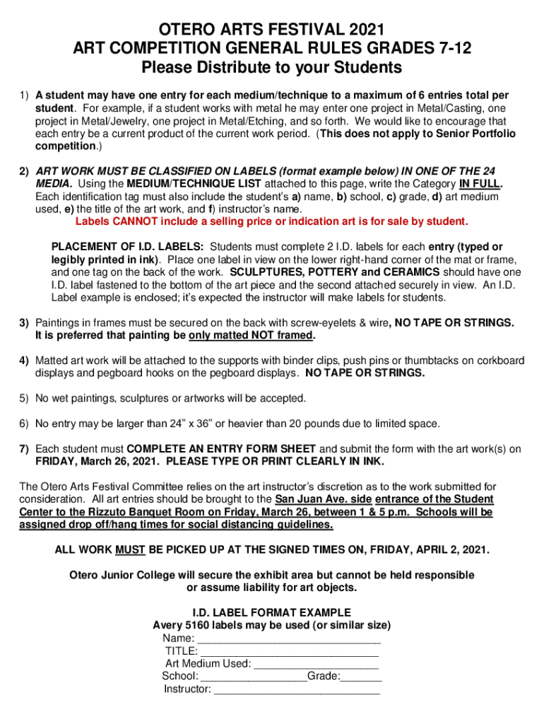 OTERO ARTS FESTIVAL 2021 ART COMPETITION GENERAL RULES GRADES 712 Please Distribute to your Students 1) A student may have one entry for each medium/technique to a maximum of 6 entries total per student.
