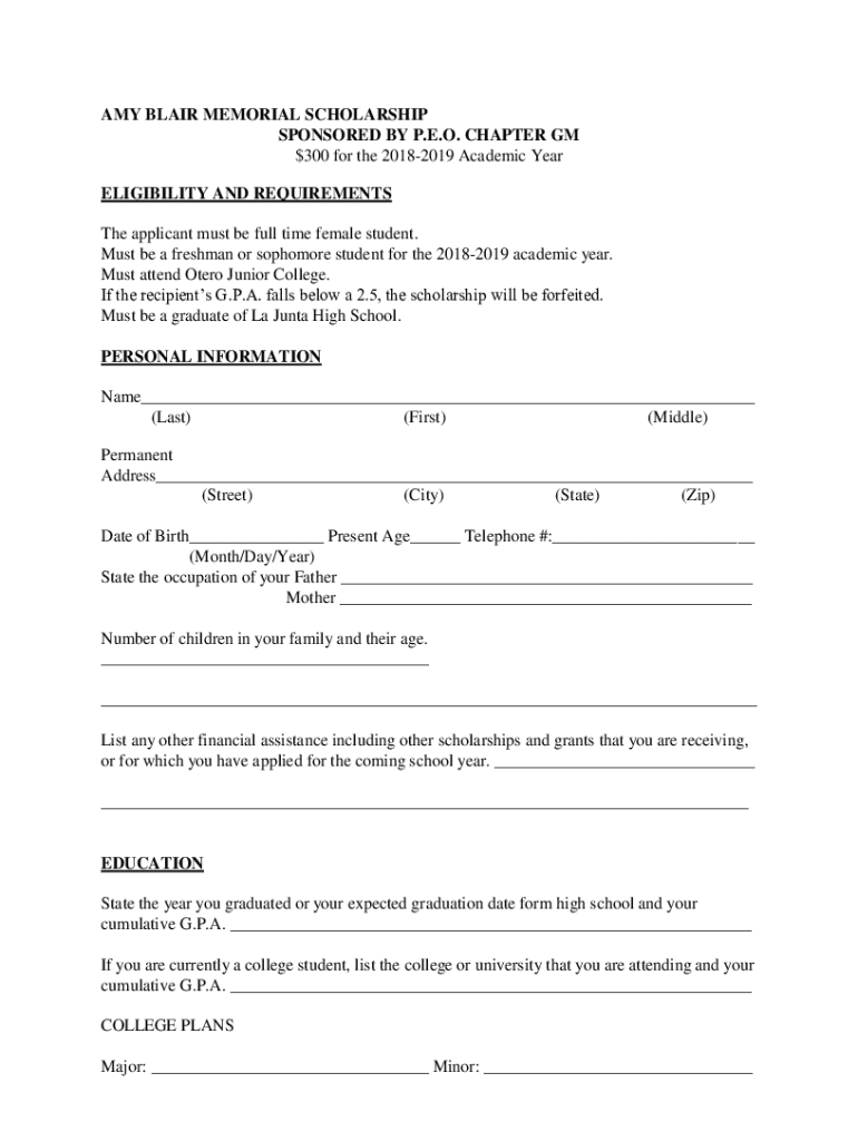 AMY BLAIR MEMORIAL SCHOLARSHIP SPONSORED BY P.E.O. CHAPTER GM $300 for the 20182019 Academic Year ELIGIBILITY AND REQUIREMENTS The applicant must be full time female student. Must be a freshman or