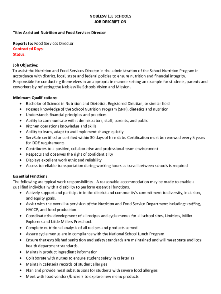 NOBLESVILLE SCHOOLS JOB DESCRIPTION Title: Assistant Nutrition and Food Services Director Reports to: Food Services Director Contracted Days: Status: Job Objective: To assist the Nutrition and Food