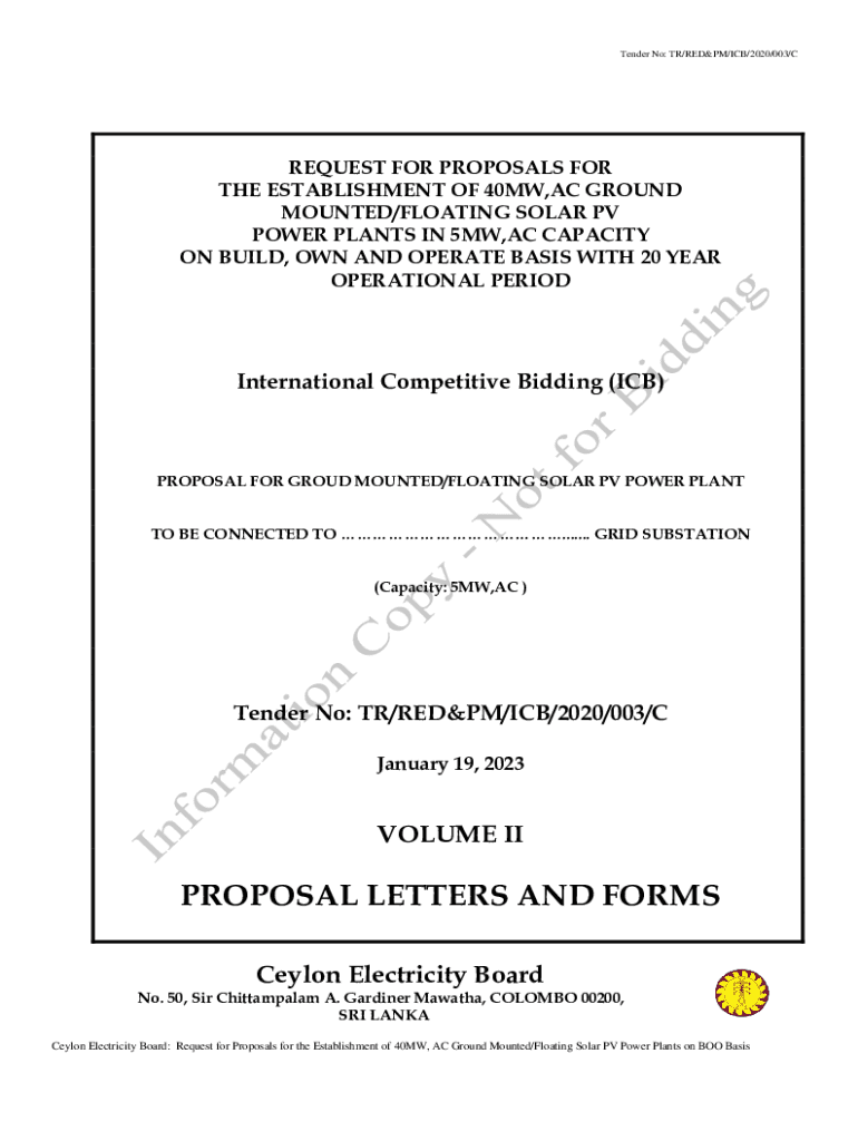 Tender No: TR/REDEEM/ICB/2020/003/REQUEST FOR PROPOSALS FOR THE ESTABLISHMENT OF 40MW,AC GROUND MOUNTED/FLOATING SOLAR PV POWER PLANTS IN 5MW,AC CAPACITY ON BUILD, OWN AND OPERATE BASIS WITH 20 YEAR