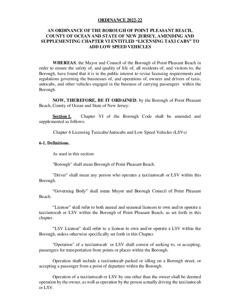 ORDINANCE 202222 AN ORDINANCE OF THE BOROUGH OF POINT PLEASANT BEACH, COUNTY OF OCEAN AND STATE OF NEW JERSEY, AMENDING AND SUPPLEMENTING CHAPTER VI ENTITLED LICENSING TAXI CABS TO ADD LOW SPEED VEHICLESWHEREAS,