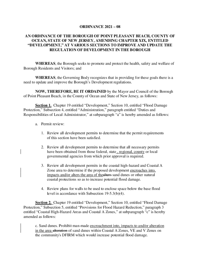 ORDINANCE 2021 08 AN ORDINANCE OF THE BOROUGH OF POINT PLEASANT BEACH, COUNTY OF OCEAN, STATE OF NEW JERSEY, AMENDING CHAPTER XIX, ENTITLED DEVELOPMENT, AT VARIOUS SECTIONS TO IMPROVE AND UPDATE THE