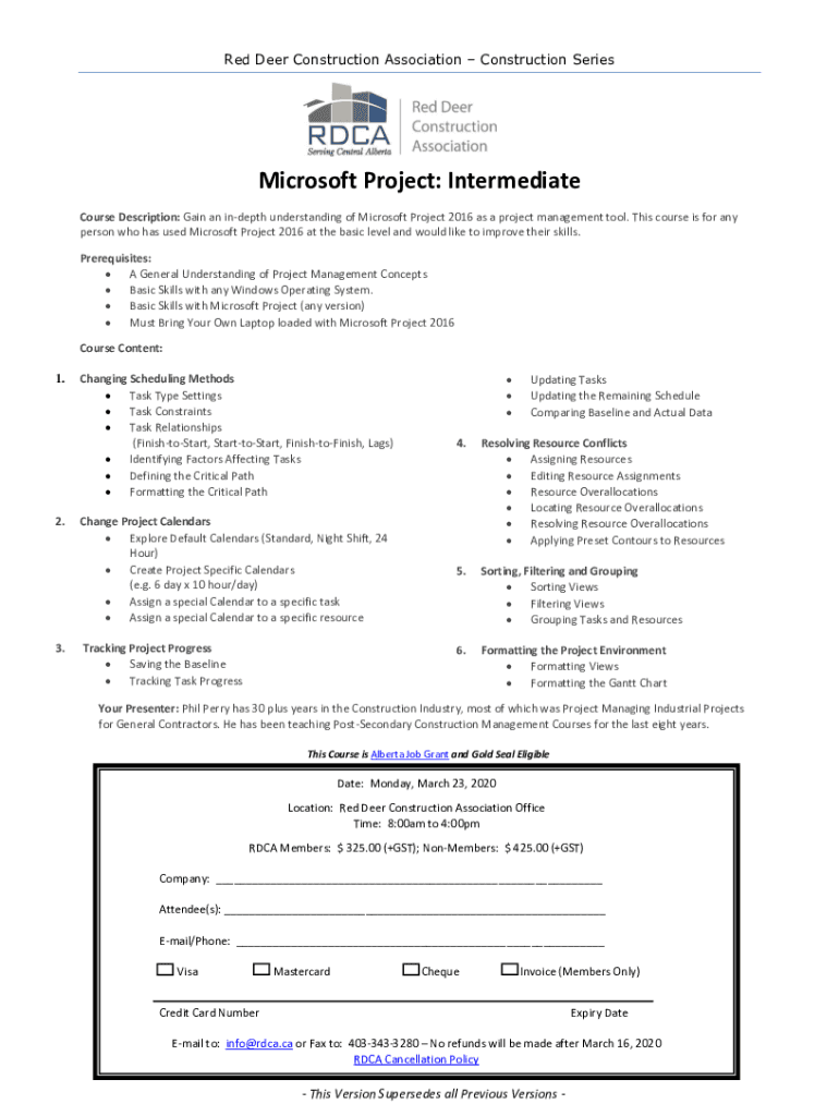 Red Deer Construction Association Construction Series Microsoft Project: Intermediate Course Description: Gain an in depth understanding of Microsoft Project 2016 as a project management tool. This