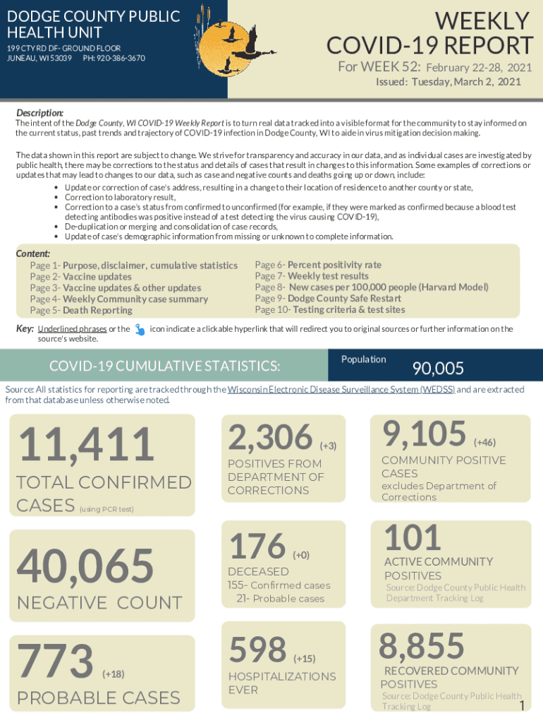 WEEKLY COVID-19 REPORTAGE COUNTY PUBLIC HEALTH UNIT 199 CITY RD OF First FLOOR JUNEAU, WI 53039 PH: 9203863670For WEEK 52:February 2228, 2021Issued: Tuesday, March 2, 2021, Description:The intent