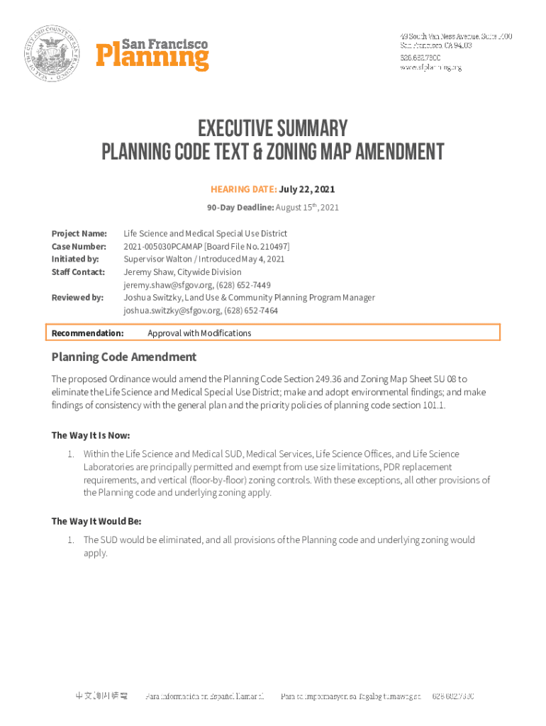 Executive Summary Planning Code Text & Zoning Map Amendment HEARING DATE: July 22, 2021 90Day Deadline: August 15th, 2021 Project Name: Case Number: Initiated by: Staff Contact: Reviewed by:Life Science