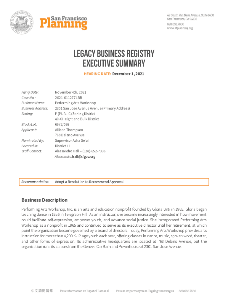 Legacy Business Registry Executive Summary HEARING DATE: December 1, 2021Filing Date: Case No.: Business Name Business Address: Zoning: Block/Lot: Applicant: Nominated By: Located In: Staff Contact:Recommendation:November