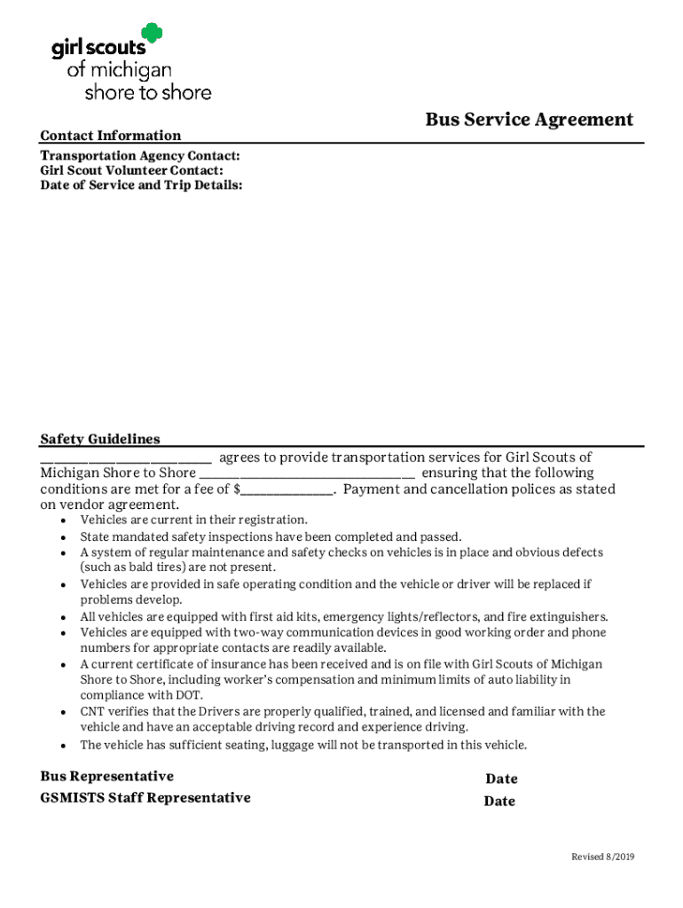 Contact Information Transportation Agency Contact:Bus Service AgreementGirl Scout Volunteer Contact: Date of Service and Trip Details:Safety Guidelines ___ agrees to provide transportation services