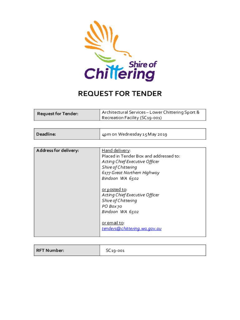 REQUEST FOR TENDER Request for Tender:Architectural Services Lower Chattering Sport & Recreation Facility (SC19001)Deadline:4pm on Wednesday 15 May 2019Address for delivery:Hand delivery: Placed in