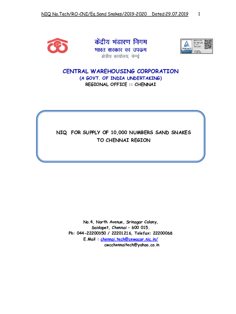 IQ No. Tech/RO CNI/EQ. Sand Snakes/20192020Dated:29.07.2019dsanzh; Hawks.k fuse Hiker JDK DK middle ash; DK;key;] pub CENTRAL WAREHOUSING CORPORATION (A GOVT. OF INDIA UNDERTAKING) REGIONAL OFFICE