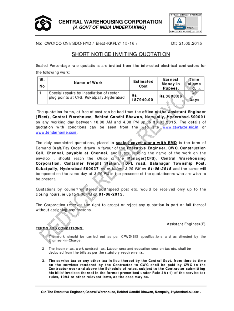 No: CWC/CC CNI/SHOULD / Electively/ 1516 /DT: 21.05.2015SHORT NOTICE INVITING QUOTATION