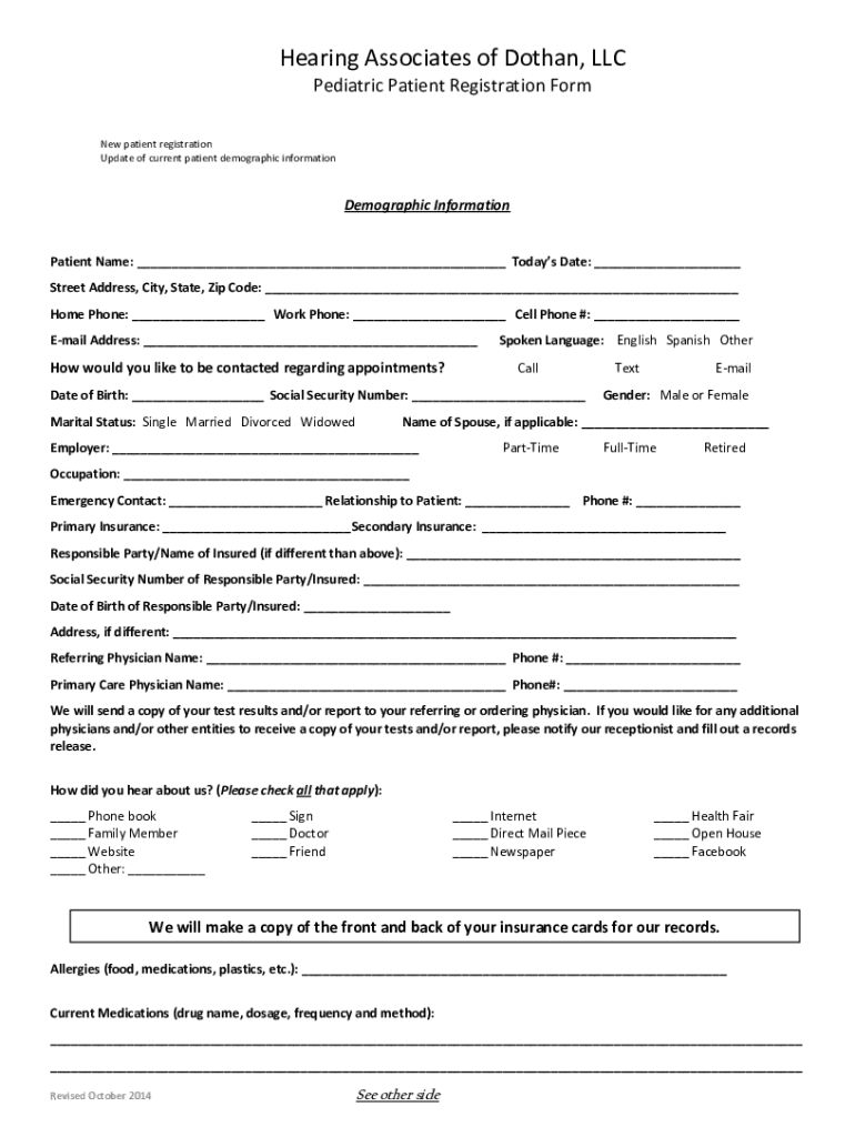 Hearing Associates of Dothan, LLC Pediatric Patient Registration Former patient registration Update of current patient demographic informationDemographic Information Patient Name: ___ Today's Date: