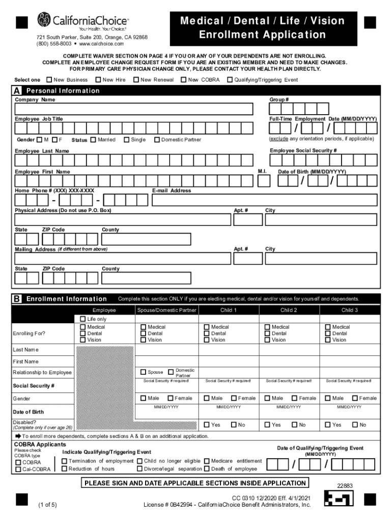Medical / Dental / Life / Vision Enrollment Application721 South Parker, Suite 200, Orange, CA 92868 (800) 5588003 www.calchoice.comCOMPLETE WAIVER SECTION ON PAGE 4 IF YOU OR ANY OF YOUR DEPENDENTS
