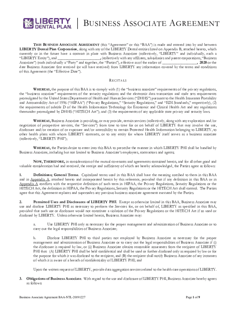 | B BUSINESS ASSOCIATE AGREEMENT THIS BUSINESS ASSOCIATE AGREEMENT (this Agreement or this BAA) is made and entered into by and between LIBERTY Dental Plan Corporation, along with any of the LIBERTY