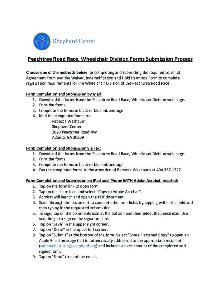 Peach tree Road Race, Wheelchair Division Forms Submission Process Choose one of the methods below for completing and submitting the required Letter of Agreement Form and the Waiver, Indemnification