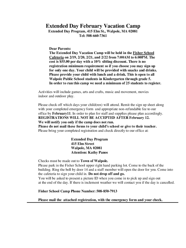 Extended Day February Vacation Camp Extended Day Program, 415 Elm St., Walpole, MA 02081 Tel: 5086607361Dear Parents: The Extended Day Vacation Camp will be held in the Fisher School Cafeteria on