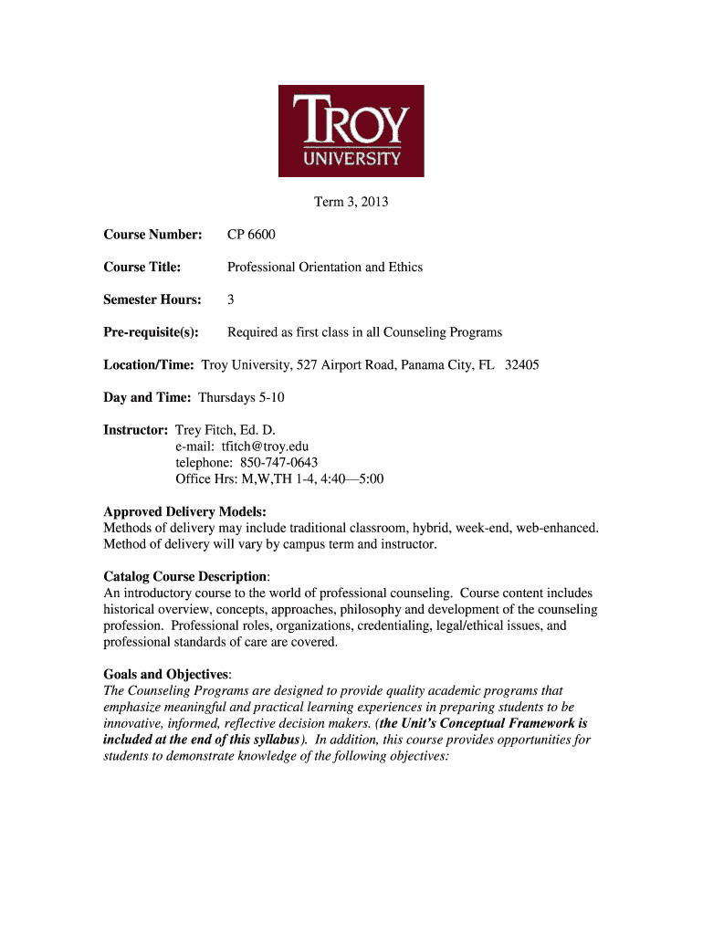 Term 3, 2013 Course Number: CP 6600 Course Title: Professional Orientation and Ethics Semester Hours: 3 Prerequisite(s): Required as first class in all Counseling Programs Location/Time: Troy University,