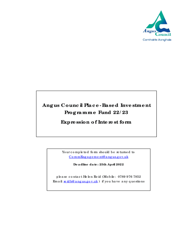 Angus Council Pleased Investment Program Fund 22/23 Expression of Interest former completed form should be returned to CommEngagement@angus.gov.uk Deadline date: 25th April 2022 please contact Helen