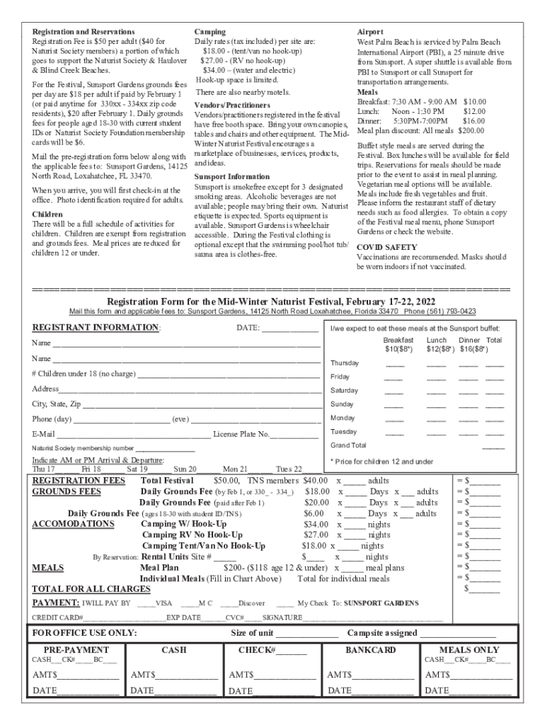 Camping Registration and Reservations Daily rates (tax included) per site are: Registration Fee is $50 per adult ($40 for $18.00 (tent/van no hookup) Naturist Society members) a portion of which $27.00