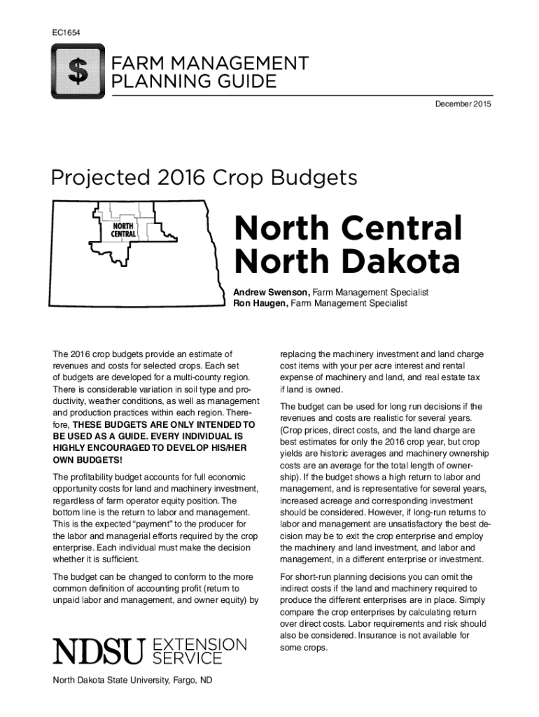 EC1654December 2015Projected 2016 Crop Budgets North Central North Dakota Andrew Swanson, Farm Management Specialist Ron Hagen, Farm Management Specialist 2016 crop budgets provide an estimate of