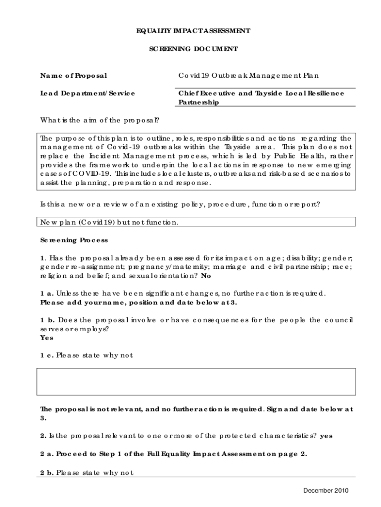 EQUALITY IMPACT ASSESSMENT SCREENING DOCUMENT Name of ProposalCovid19 Outbreak Management Planned Department/ServiceChief Executive and Wayside Local Resilience PartnershipWhat is the aim of the proposal?