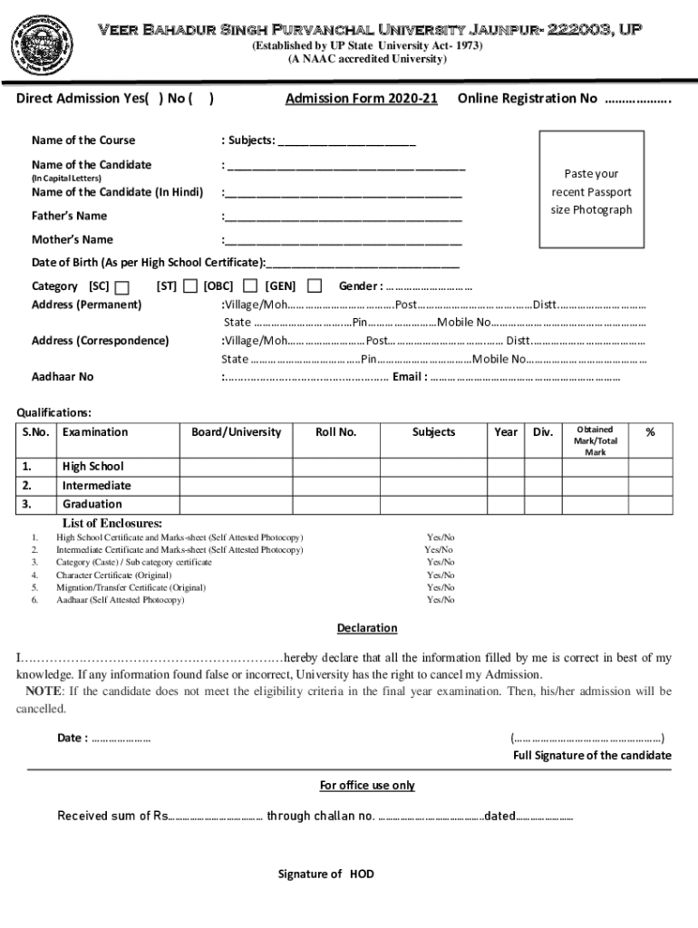 Veer Broader Singh Purvanchal University Jaipur 222003, UP (Established by UP State University Act 1973) (A NAACP accredited University)Direct Admission Yes() No ()Admission Form 202021Online Registration