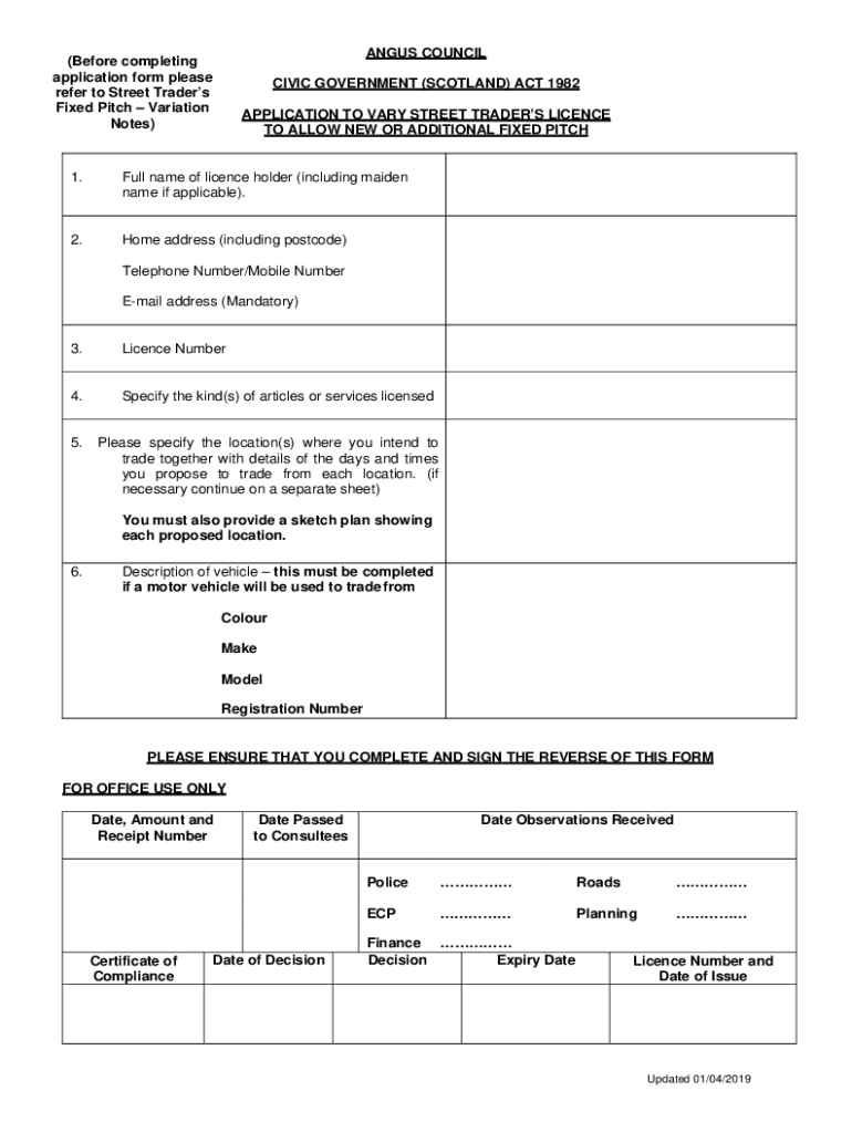 ANGUS COUNCIL(Before completing application form please refer to Street Traders Fixed Pitch Variation Notes)CIVIC GOVERNMENT (SCOTLAND) ACT 1982 APPLICATION TO VARY STREET TRADERS License TO ALLOW