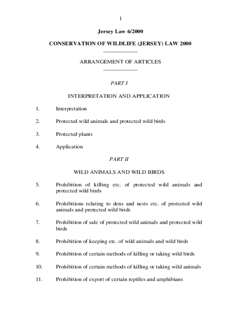 1 Jersey Law 6/2000 CONSERVATION OF WILDLIFE (JERSEY) LAW 2000 ___ ARRANGEMENT OF ARTICLES ___ PART I INTERPRETATION AND APPLICATION 1. Interpretation2. Protected wild animals and protected wild birds3.