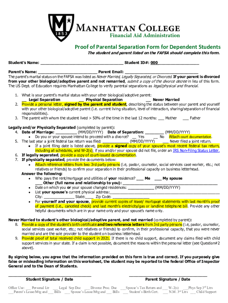 Proof of Parental Separation Form for Dependent Students The student and parent listed on the FAFSA should complete this form. Students Name: ___ Student ID#: 000 ___ Parents Name: ___ Parent Email:
