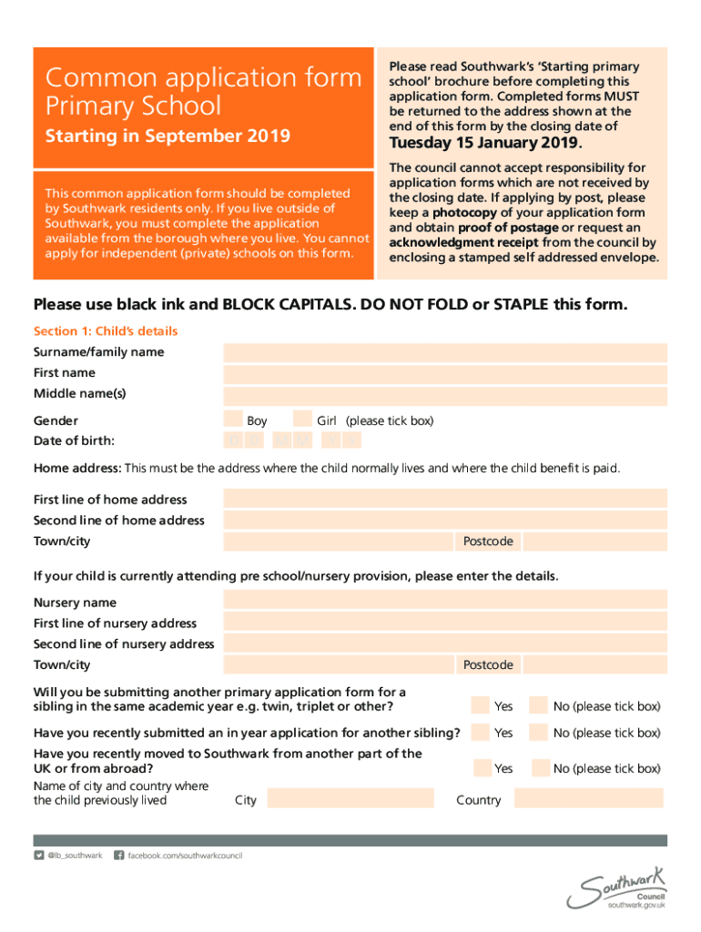 Common application form Primary School Starting in September 2019Please read Southwards Starting primary school brochure before completing this application form. Completed forms MUST be returned to