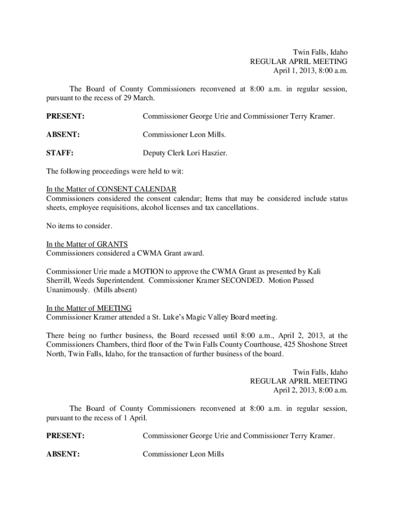 Twin Falls, Idaho REGULAR APRIL MEETING April 1, 2013, 8:00 a.m. The Board of County Commissioners reconvened at 8:00 a.m. in regular session, pursuant to the recess of 29 March. PRESENT:Commissioner