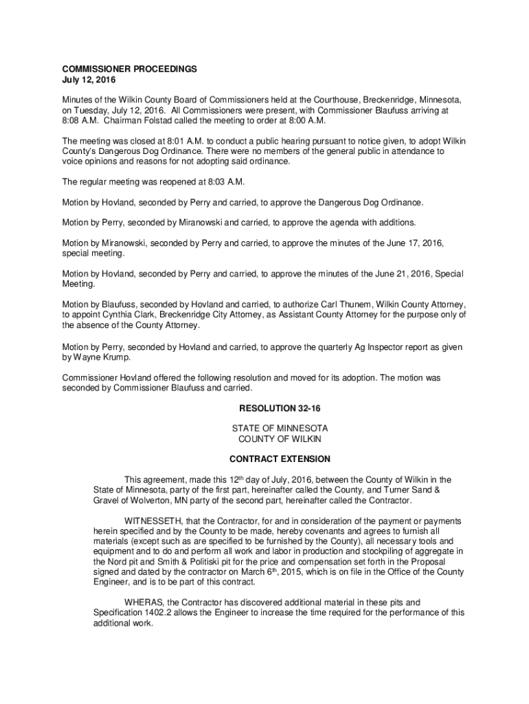 COMMISSIONER PROCEEDINGS July 12, 2016, Minutes of the Wilkins County Board of Commissioners held at the Courthouse, Breckenridge, Minnesota, on Tuesday, July 12, 2016. All Commissioners were present,