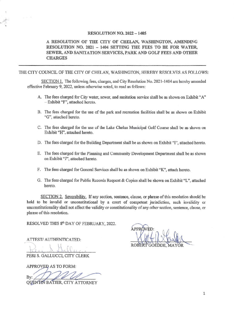 RESOLUTION NO.2022 1405A RESOLUTION OF THE CITY OF CLAN, WASHINGTON, AMENDING RESOLUTION NO. 2021 1404 SETTING THE FEES TO BE FOR WATER, SEWER, AND SANITATION SERVICES, PARK AND GOLF FEES AND OTHER