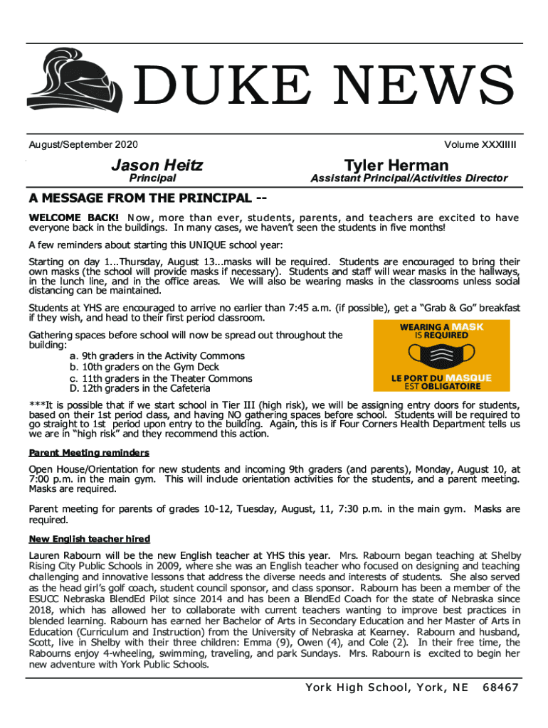 DUKE NEWS August/September 2020Jason Hat PrincipalVolume XXXIIIIITyler HermanAssistant Principal/Activities Director MESSAGE FROM THE PRINCIPAL WELCOME BACK! Now, m ore than ever, students, parents,